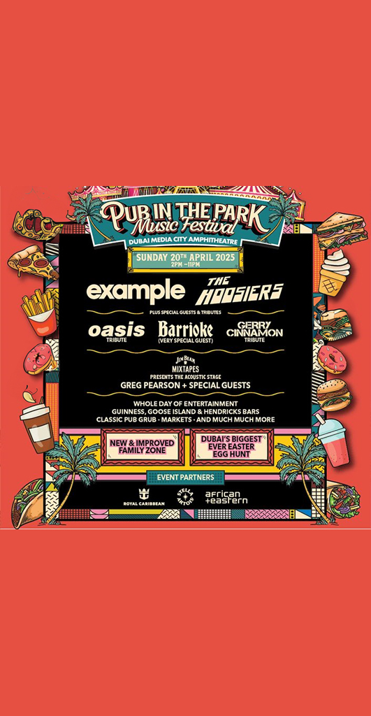 Pub in the Park 2025 promises an memorable festival experience with a world-class lineup of artists, delicious food, and a family-friendly atmosphere. This year’s headliners include Example and The Hoosiers, along with top tribute performances, including an Oasis tribute band and Gerry Cinnamon tribute. A unique Barrioke performance, led by the UK’s biggest karaoke host, adds a fun, interactive element. The Best of British Area offers classic pub food, while the Family Zone provides inflatables, games, and Dubai’s largest Easter Egg Hunt, making it a must-visit event for all ages.